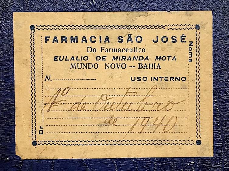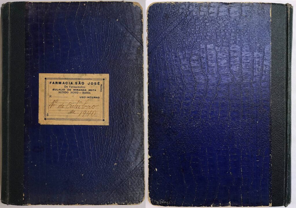 Não possui cabeceado (parte de tecido que pode ser costurado ou colado no miolo, nas extremidades, servindo para estabilizá-lo. Geralmente, são apresentadas com tecitura em quadriculação ou espiral, em diversas cores), seus cortes anterior, superior e inferior não possuem decoração/ilustração e não apresentam bordas quebradiças (fragilidade nas regiões dos cortes do papel, geralmente acompanhada de rasgos e perdas. Dano físico causado geralmente por quebra das cadeias de celulose do papel e/ou por guarda inadequada (Paglione, 2017, p. 32)) nas folhas. As medidas externas do caderno, considerando a encadernação, são de 167mm de largura; 238mm de comprimento; 25mm de espessura, na parte da lombada; 20mm de espessura, na parte lateral direita; pesando um total de 656 gramas. As medidas do miolo do caderno são de 160mm de largura, 229mm de comprimento e 19mm de espessura. Seguem as imagens da capa frontal, de fechamento e da etiqueta do caderno Farmácia São José.