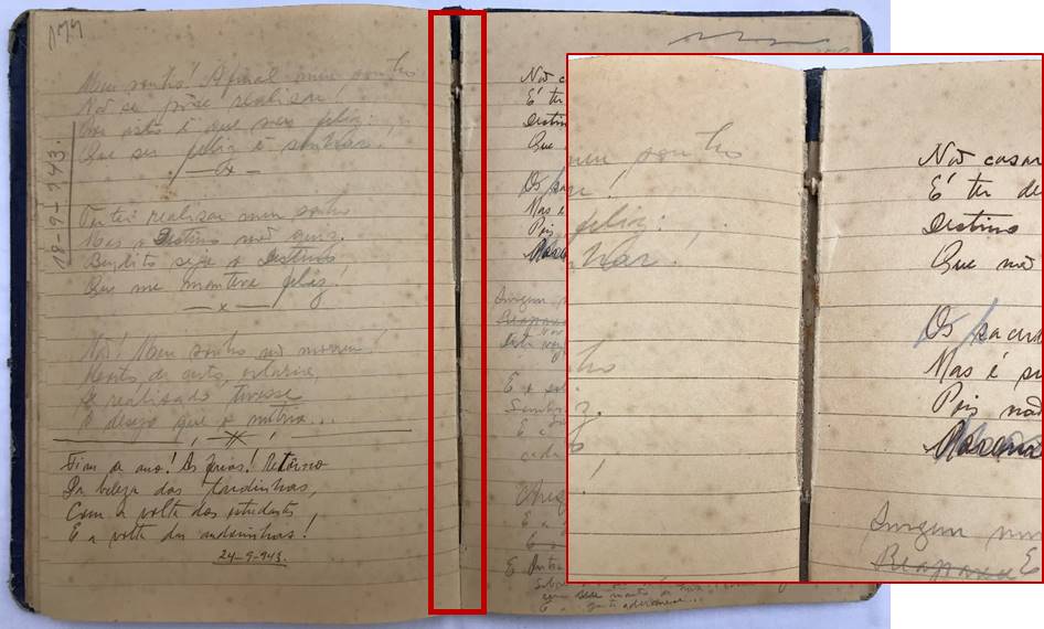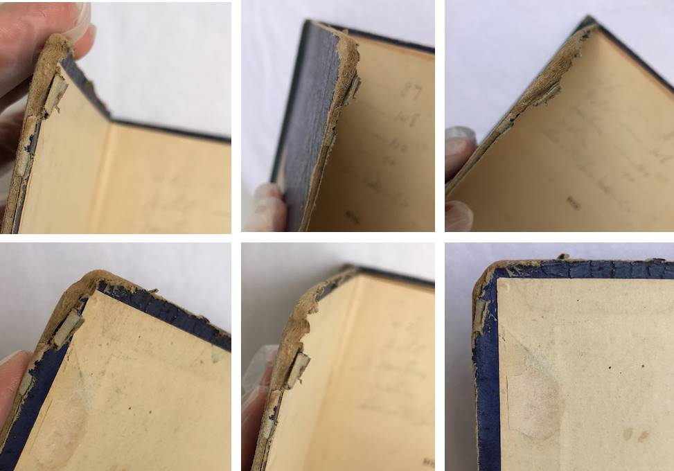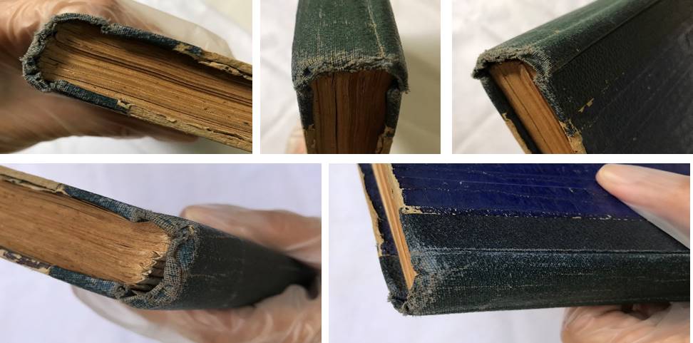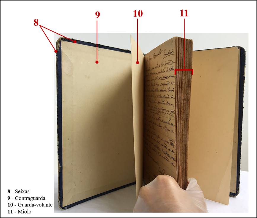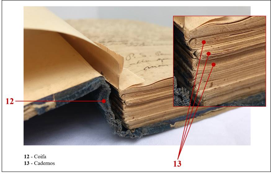 As extremidades laterais do caderno, assim como as ponteiras, que são arredondadas, apresentam desgaste expondo o papelão das capas, revelando uma delaminação.
