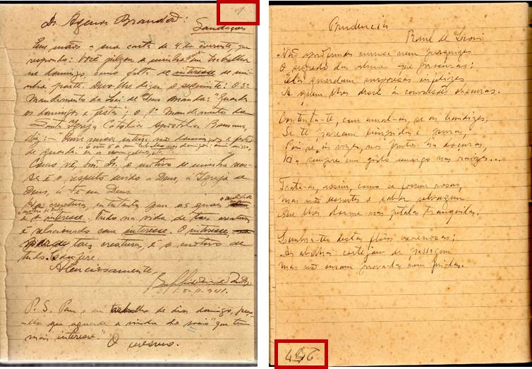 Apesar de considerá-lo um caderno de rascunhos, não é possível afirmar que o caderno é composto totalmente por rascunhos de textos, pois há diversas anotações cotidianas, financeiras e notas pessoais que, provavelmente, não foram feitas com a intenção de serem passadas a limpo. Contudo, a maior parte do caderno é composta por rascunhos de obras literárias e cartas, pessoais e abertas. Grande parte dos rascunhos encontrados no caderno apresentam rasuras, borrões, emendas, por vezes com letras miúdas, apêndices em outras páginas indicados por notas remissivas, apagamento por borracha, cancelamentos, divisões gráficas da página, entre outras “marcas físicas de manipulação” (Duarte, [1997-], verbete rascunho, p. 12) feitas pelo escrevente no processo de composição do texto. Todas essas marcas fazem parte da história do caderno, nos emitem um significado, como a forma de cancelar, os tipos de rasura, a forma de disposição do texto na página, a organização dos apêndices, transmitindo uma mensagem com possibilidades de interpretação. Por conta de algumas dessas marcas físicas de manipulação, como apagamento por borracha, segmentos substiruídos por sobreposição, acréscimos com letras miúdas, borrões, que não permitem que o segmento esteja legível, houve dificuldade, de certa forma, para realizar a leitura e transcrição dos documentos e, em alguns pontos, chegou a ser inviável.