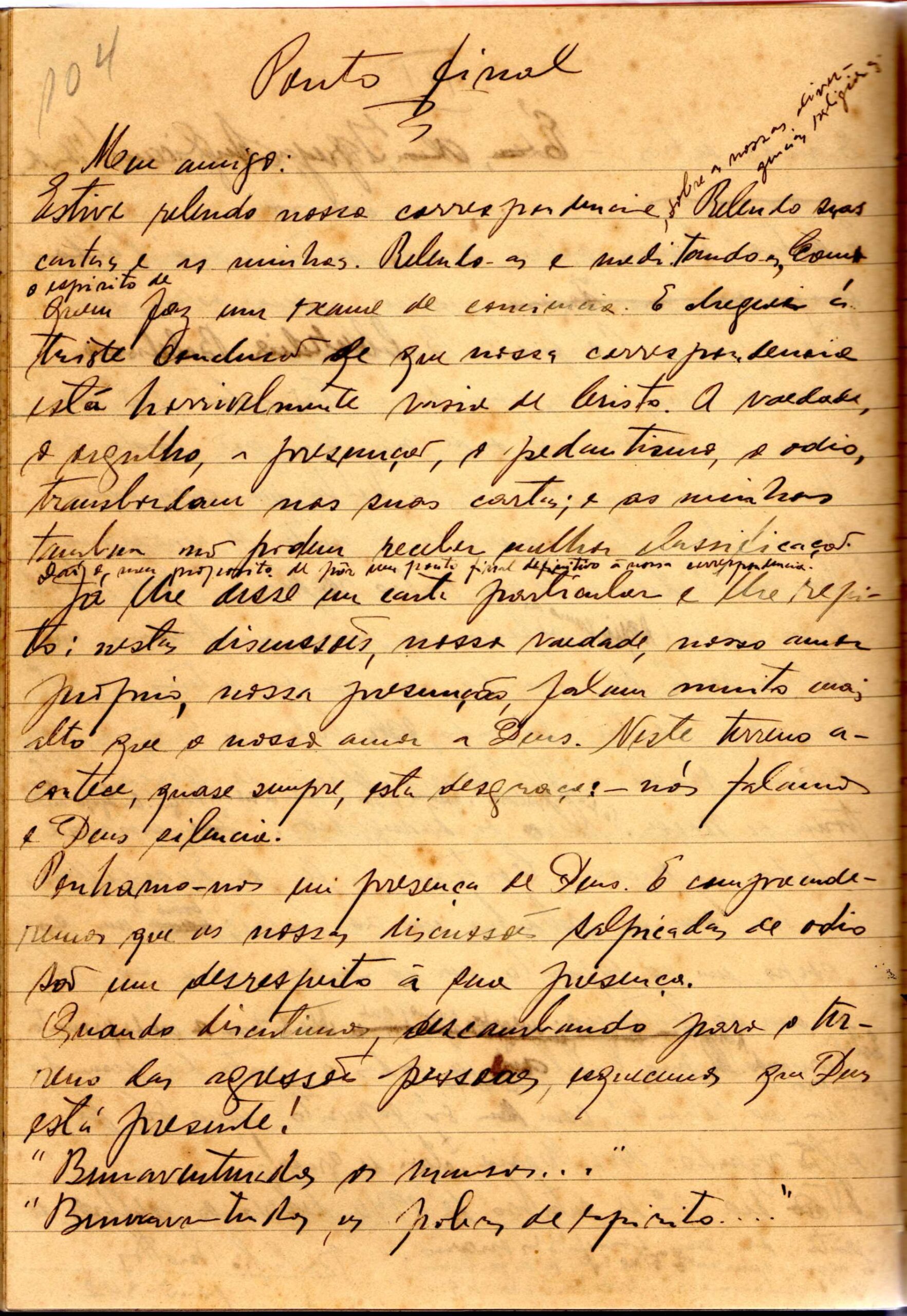 | 19 | ![]() | Ponto final | 03/1942 | 104 e 105 | Religião. Catolicismo. Protestantismo. Neste rascunho de carta, Motta inicia dizendo que estava relendo a correspondência que trocou com Eudaldo, tanto as que escreveu quanto as que recebeu e que as meditou, chegando à conclusão de que toda a correspondência estava horrivelmente vazia de Cristo. Assim, Motta diz querer pôr um ponto final definitivo à correspondência deles e relembra uma afirmação que fez em carta anterior, de que nessas discussões, a vaidade, o amor próprio e a presunção falam mais alto do que o amor deles a Deus e, dessa forma, quando eles falam, Deus silencia. |