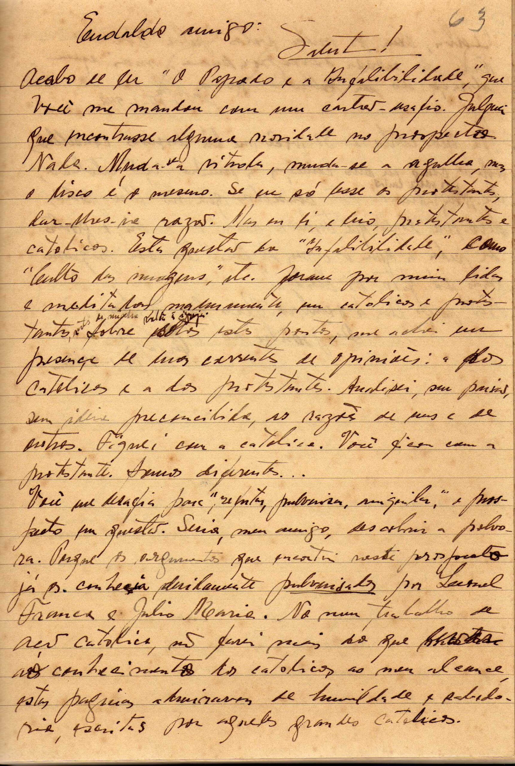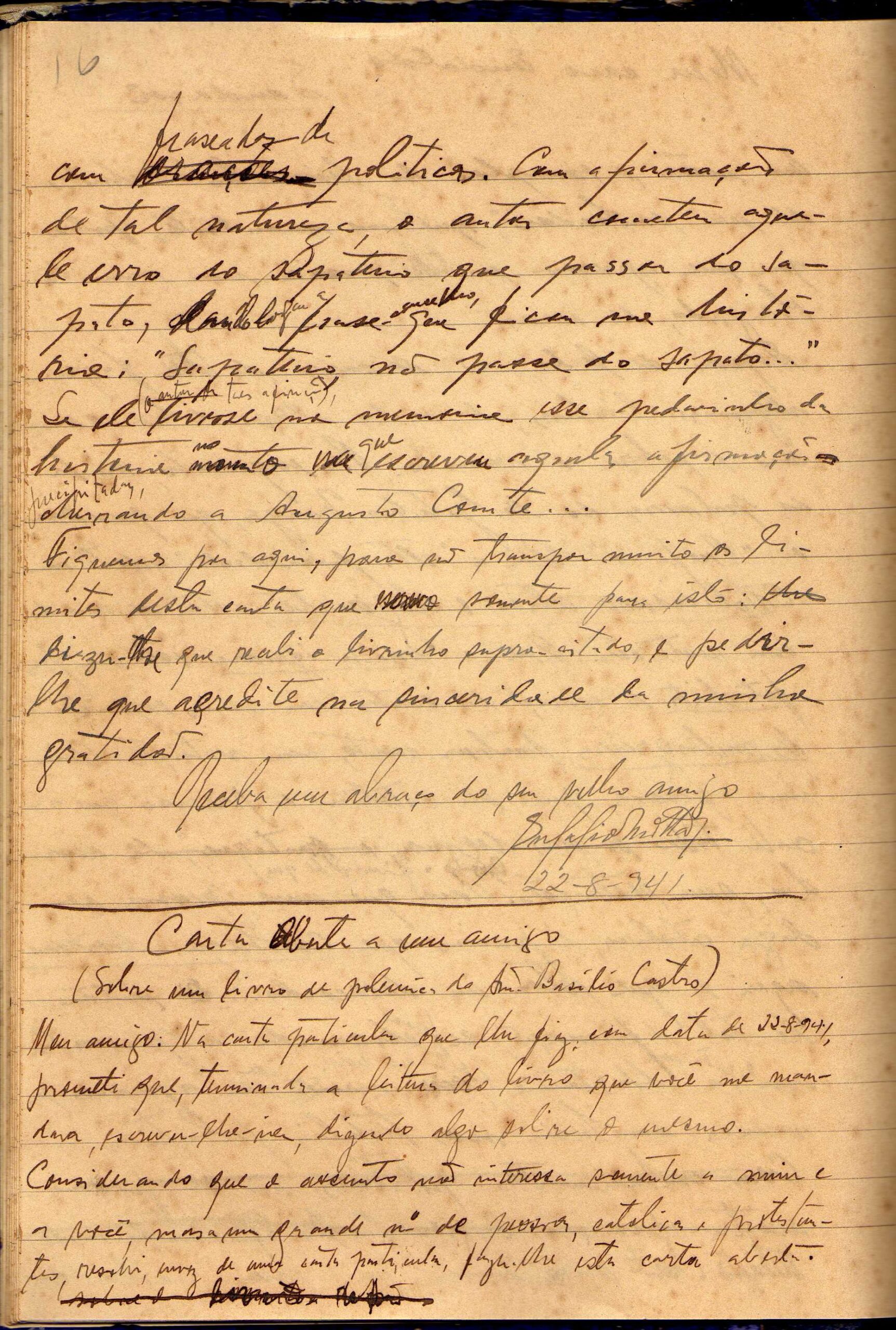 | 10 | ![]() | Eudaldo amigo: Salutem! | Acabo de ler “O Papado e a Infalibilidade” | 14/01/1942 | 63 e 64 | Religião. Literatura. Catolicismo. Protestantismo. Neste rascunho de carta, Motta afirma ter finalizado a leitura do prospecto enviado, anteriormente, por Eudaldo Lima e que o prospecto havia sido acompanhado de um cartão-desafio para a refutação do mesmo. Motta então diz que esta tarefa já havia sido cumprida por Leonel Franca e Julio Maria. Finaliza dizendo que agradecia os conselhos não solicitados dados por Eudaldo sobre como conduzir sua Ação Católica e encerra dizendo “Sou pequeno, mas só fito os Andes” e que não pede luz às sombras, e sim à luz. |