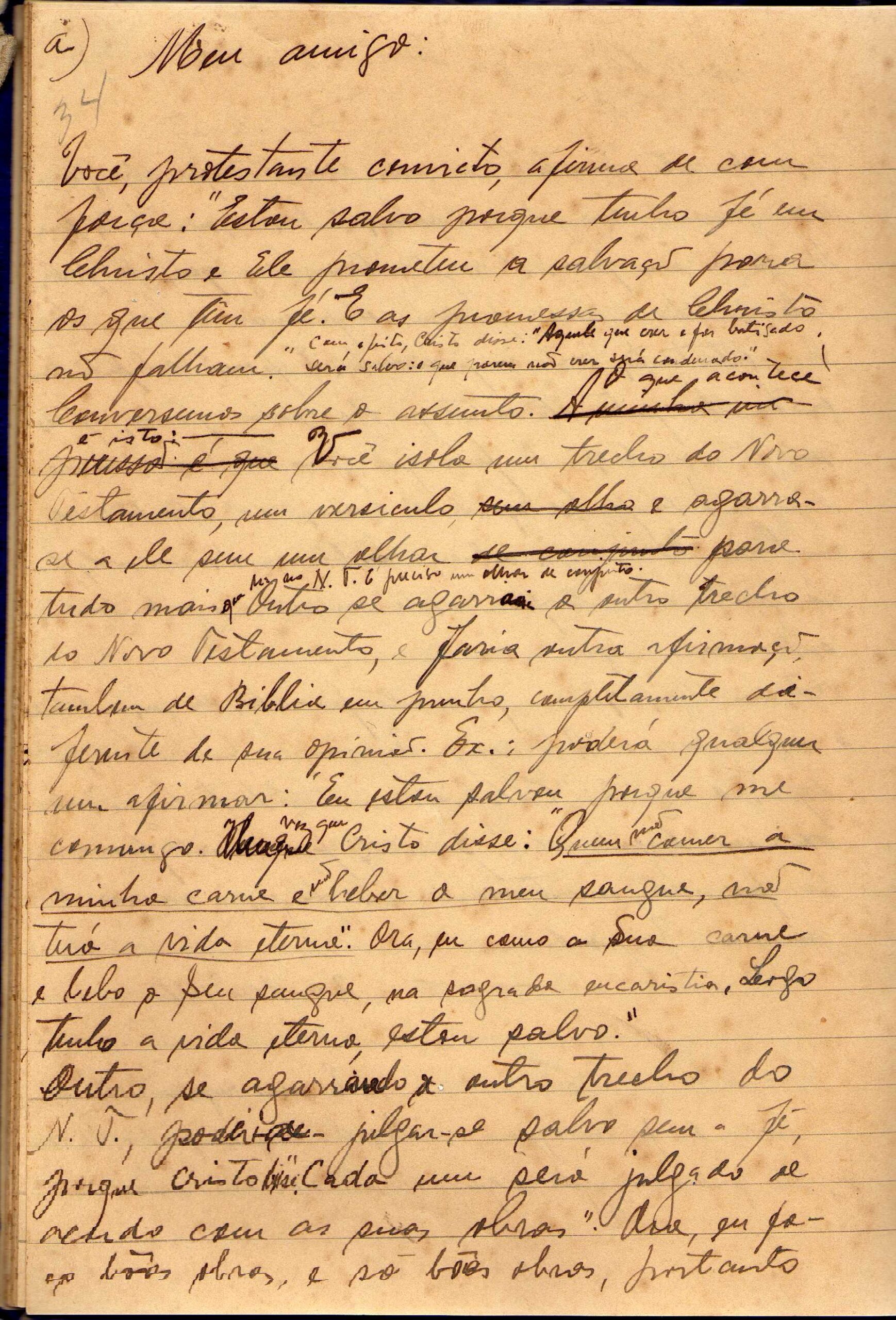 | 3 | ![]() | a) Meu amigo: | Você, protestante convicto | 09/11/1941 | 34 e 35; 38 a 40 | Religião. Bíblia. Catolicismo. Protestantismo. Este rascunho de carta não apresenta destinatário explícito, porém, após análise do conteúdo, concluiu-se que foi escrito para Eudaldo Lima. O rascunho se trata de uma resposta a uma carta que Motta recebeu, em que ele cita partes da carta e comenta pontos sobre os quais discorda, fazendo diálogo com passagens bíblicas para dar suporte à sua argumentação. |