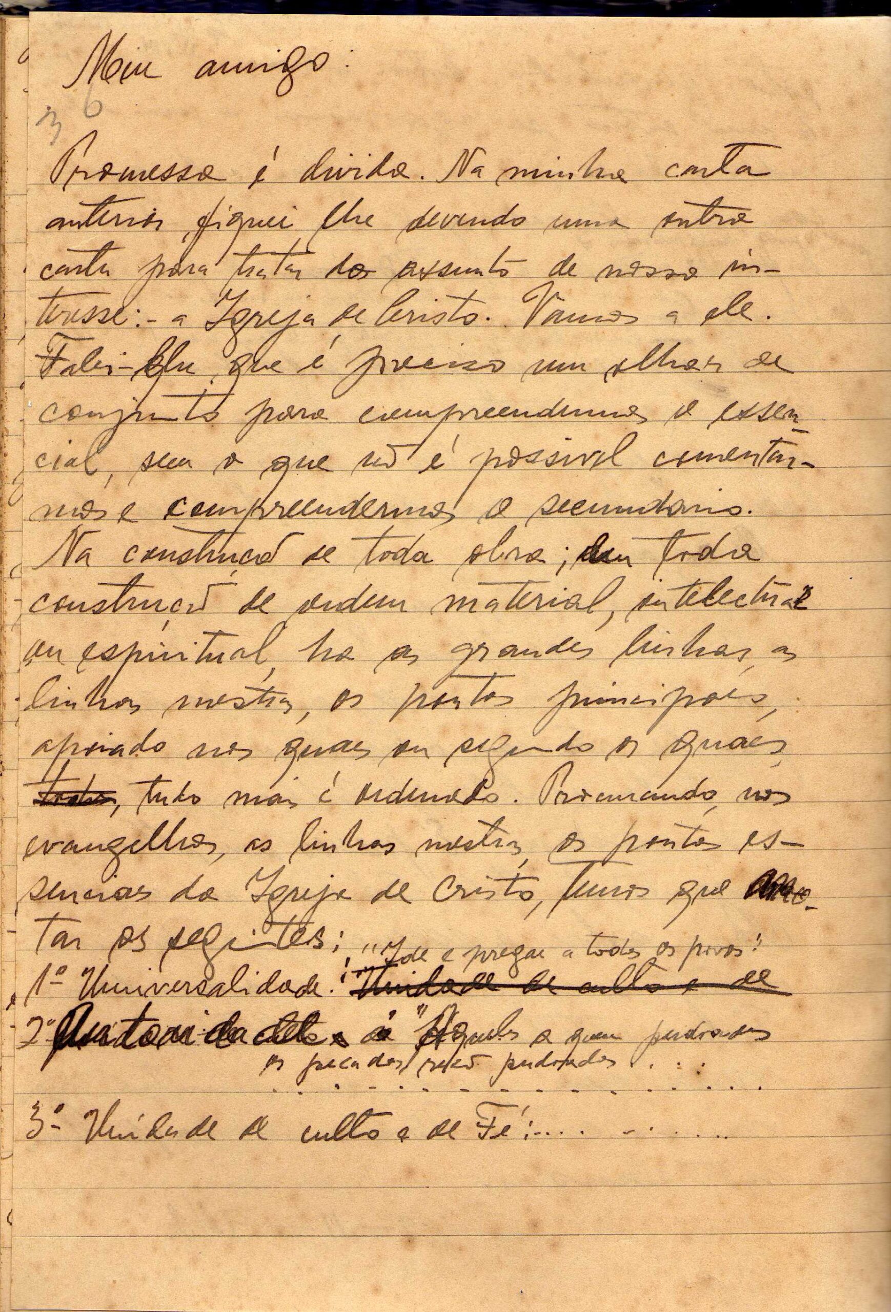 | 6 | ![]() | Eudaldo amigo Salutem! | Ausente, em trabalhos na Fazenda | 14/12/1941 | 48 a 50 | Religião. Literatura. Catolicismo. Protestantismo. Neste rascunho de carta, Motta acusa o recebimento de mais dois livros que lhe foi enviado por Eudaldo Lima. Segue dizendo que não poderá fazer a leitura rapidamente pois havia outras leituras em andamento e diz que se Eudaldo não estivesse afastado do rebanho (católico), as suas leituras se alinhariam. Faz uma reflexão sobre os erros que cometera enquanto estava afastado da Igreja Católica e lamenta o fato de Eudaldo se encontrar afastado do catolicismo. |