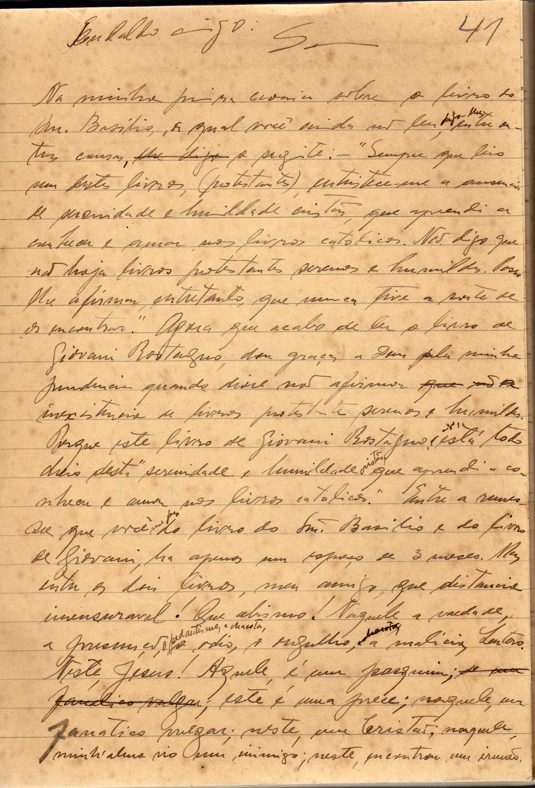 | 5 | ![]() | Eudaldo amigo: Saudações | Na minha primeira cronica sobre o livro do Snr. Basilio | 18/11/1941; 25/11/1941 | 41 a 43 | Religião. Literatura. Catolicismo. Protestantismo. Neste rascunho de carta, Motta comenta ter finalizado o livro que Eudaldo Lima lhe enviou, do autor protestante Giovanni Rostagno. O nome do livro não foi mencionado, mas Motta faz um comparativo entre ele e o livro Cochilos de um Sonhador, do autor protestante Basílio Catalá Castro, tecendo elogios ao livro de Rostagno e críticas negativas ao livro de Catalá Castro. Também, compara o livro de Rostagno ao livro Imitação de Cristo, do Pe. Thomas de Kempis, e diz que o colocará em sua estante com os demais livros católicos que possuía. |