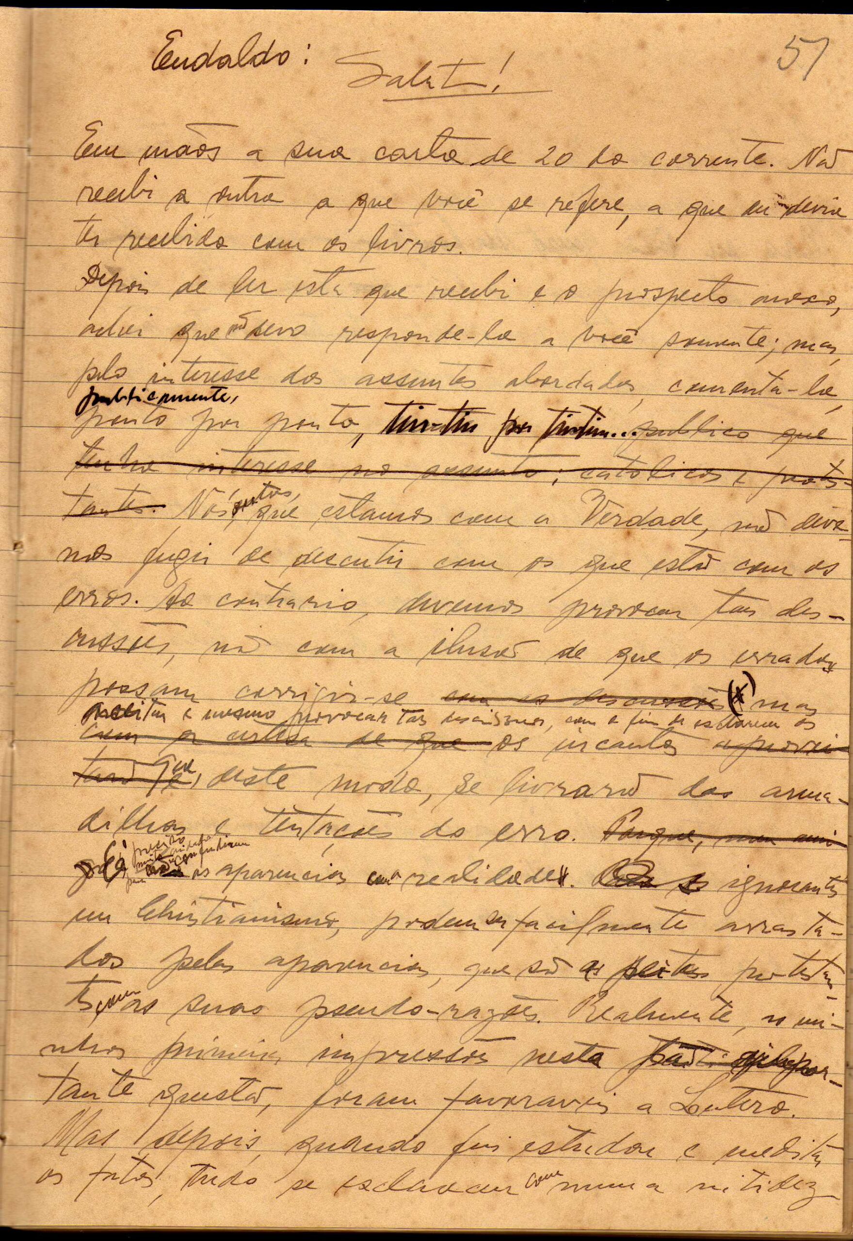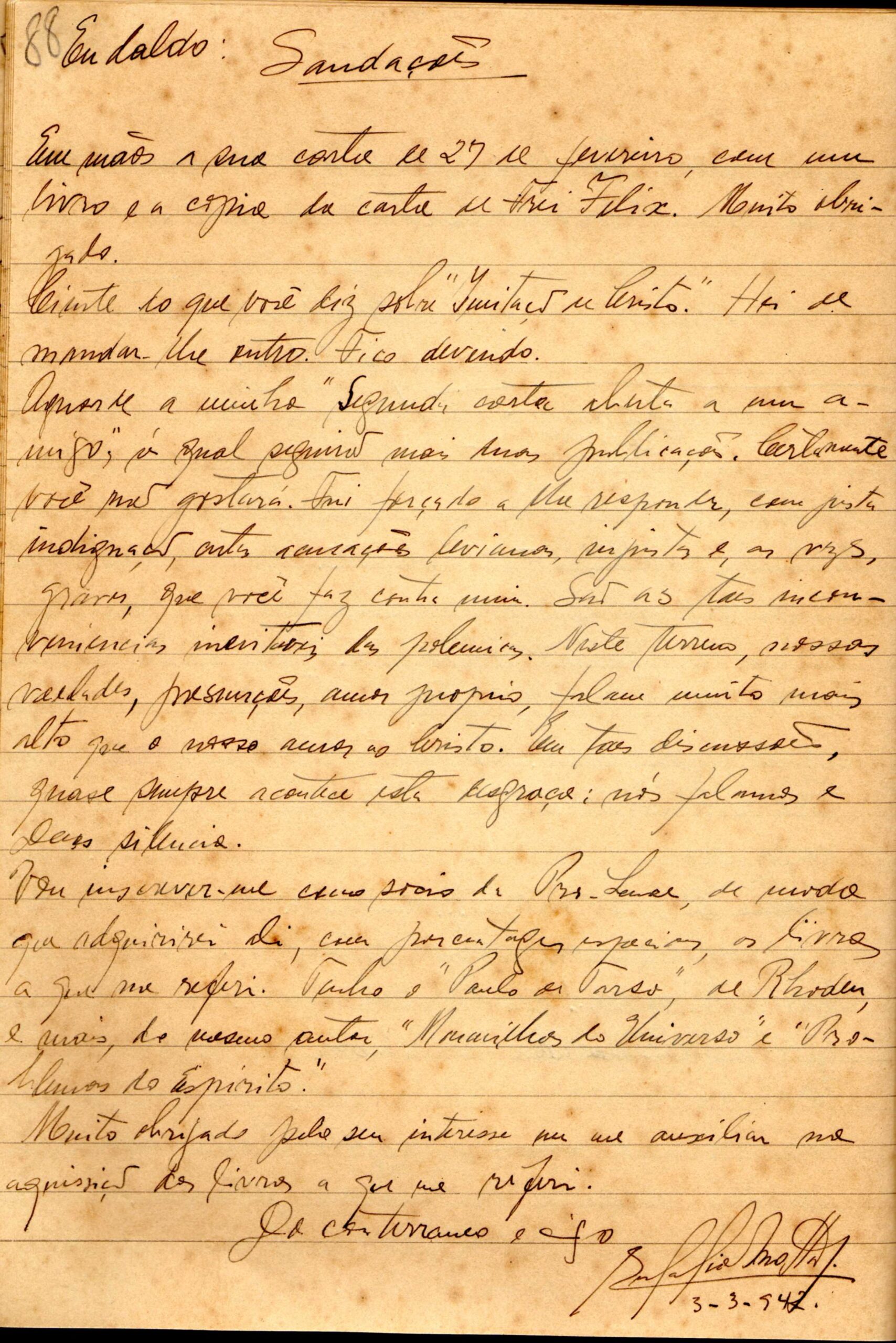 | 16 | ![]() | Eudaldo: Saudações | Em mãos a sua carta de 27 de fevereiro | 03/03/1942 | 88 | Religião. Literatura. Catolicismo. Protestantismo. Neste rascunho de carta, Motta acusa o recebimento de carta de Eudaldo juntamente com um livro e uma cópia da carta de Frei Felix. Motta avisa para Eudaldo aguardar a sua segunda carta aberta a um amigo, que seria seguida de mais duas, e que Eudaldo não iria gostar, pois ele responderia as acusações “levianas, injustas e, as vezes, graves” que Eudaldo fez contra ele. Por fim, comenta que iria se inscrever como sócio do que parece ser um clube do livro para receber descontos quando fosse adquirir livros e comenta títulos que já possui: Paulo de Tarso, Maravilhas do Universo e Problemas do Espírito, todos e autoria de Rhoden. |