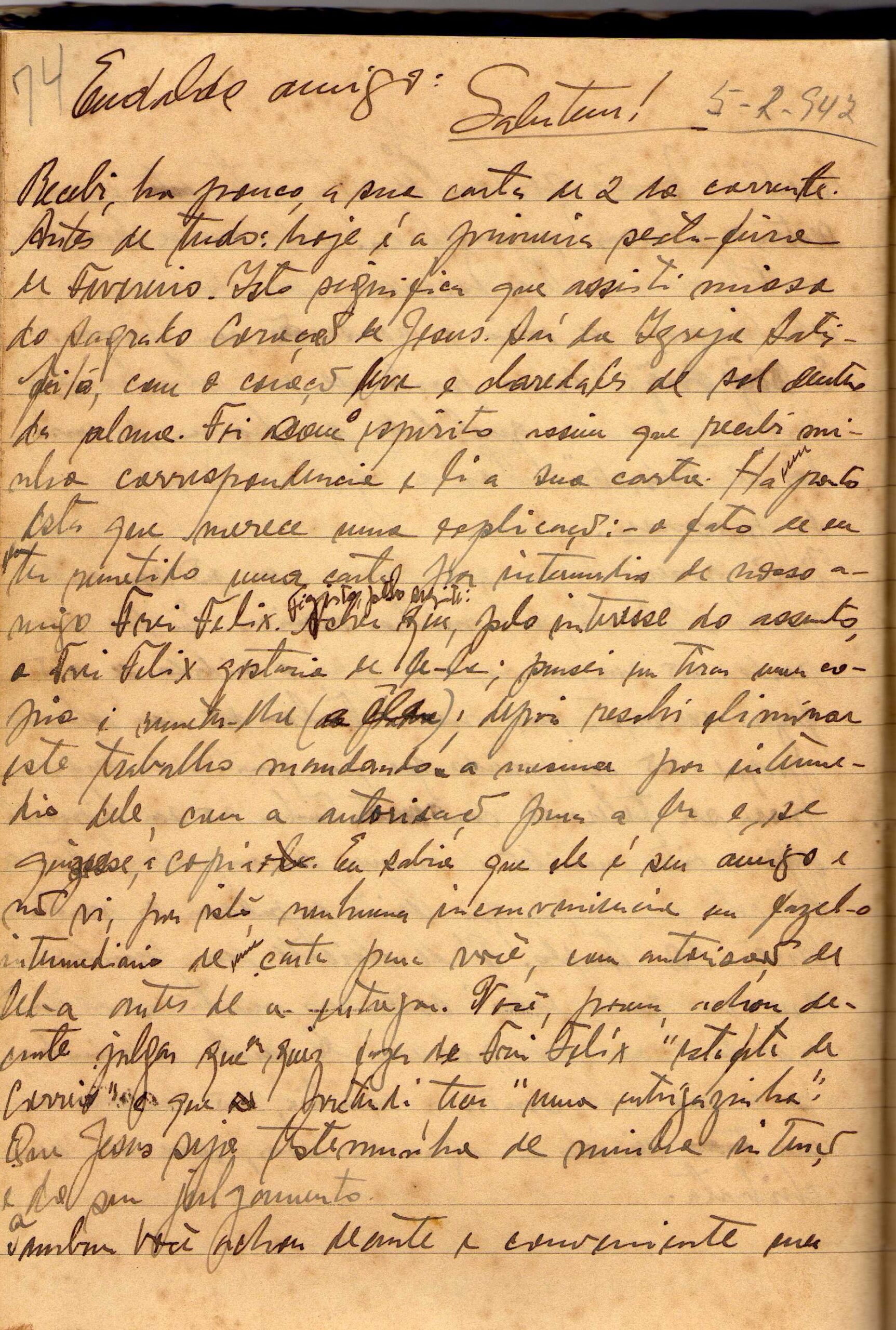 | 14 | ![]() | Eudaldo amigo: Salutem! 5-2-942 | 06/02/1942 | 74 a 84 | Religião. Literatura. Catolicismo. Protestantismo. Neste rascunho de carta, Motta acusa o recebimento da carta datada de 02/02/1942 e sinaliza estar escrevendo a resposta no dia do Sagrado Coração de Jesus, dando a entender que a responderia de forma pacífica. Em seguida, enfatiza que há um ponto na carta de Eudaldo que merecia explicação: Motta havia enviado uma carta para Eudaldo por intermédio de Frei Felix, um amigo em comum, e o autorizou a abrir, ler e tirar cópia da missiva, caso fosse de seu interesse. Contudo, não foi do agrado de Eudaldo que acusou Motta de fazer de Frei Felix uma “estafeta de correio” e de tentar causar intrigas. Motta então se defende, afirmando que não achou que seria uma inconveniência e que Jesus era testemunha de suas intenções. Além disso, Motta reafirma elogios que tecera sobre o livro protestante de Giovani Rostagno e o compara com o livro de Basilio Catalá, sendo que para este último ele faz comentários negativos. Então, Motta comenta, em resposta a carta que recebeu de Eudaldo, sobre um crime de assassinato cometido pelo Padre Luiz Santiago e um fiel católico, Venâncio Alves de Lima, lamentando o ocorrido e pedindo compaixão. Por fim, Motta rebate outro comentário feito por Eudaldo em sua carta, desta vez, de caráter político, em que Eudaldo acusa Motta de ter sido um entusiasta do regime hitlerista no Brasil. |