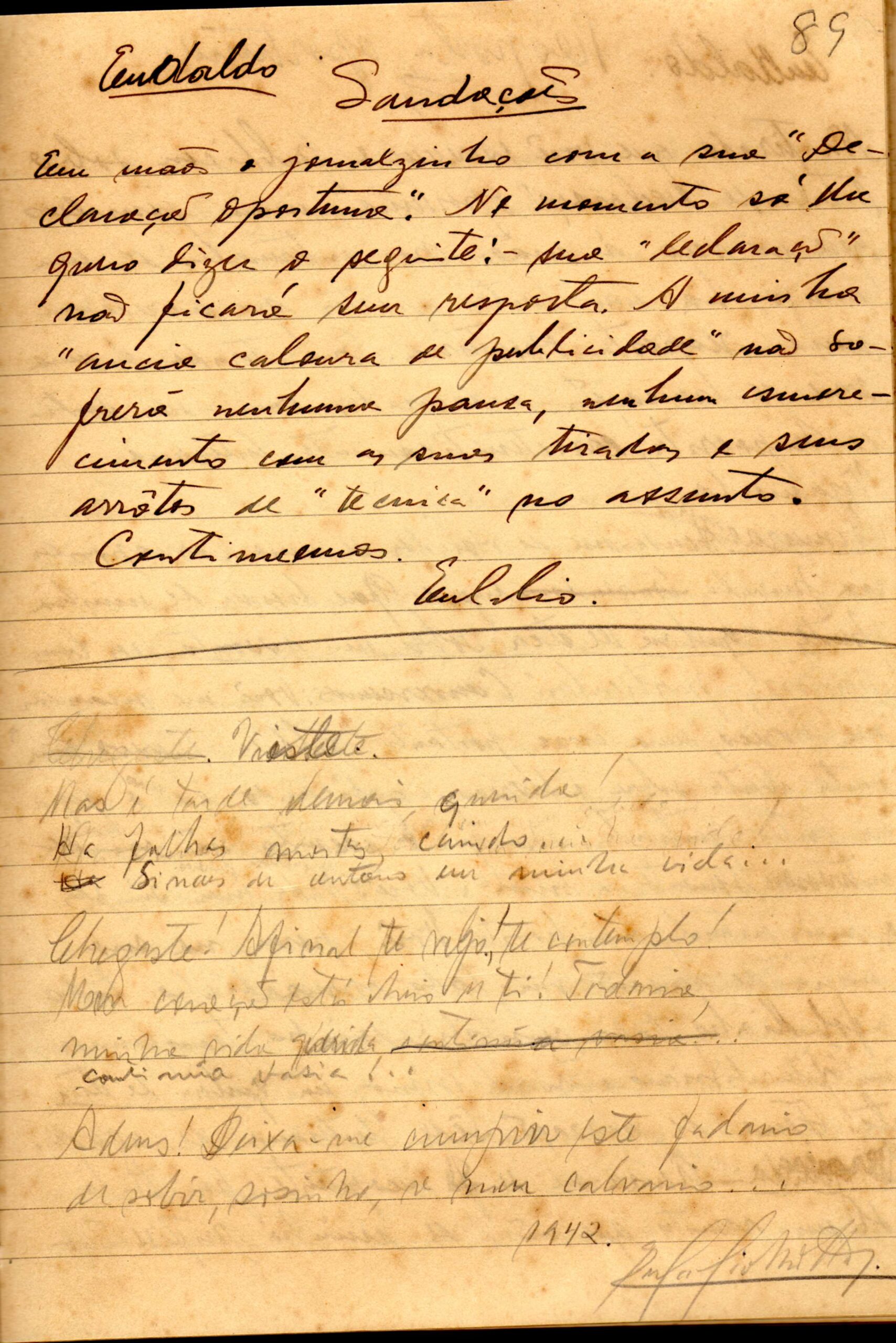 | 1 | ![]() | Meu caro Eudaldo: Saudações | 22/08/1941 | 14-16 | Religião. Literatura. Catolicismo. Protestantismo. Início do debate religioso entre Eulálio Motta e Eudaldo Lima no caderno Farmácia São José. Este rascunho de carta se trata do agradecimento pelo envio, por parte de Eudaldo Lima, do livro protestante Cochilos de um Sonhador, de Basílio Catalá Castro e da promessa de um comentário sobre o livro. Também teceu comentários sobre o prólogo, de autoria de Getúlio Vargas. |