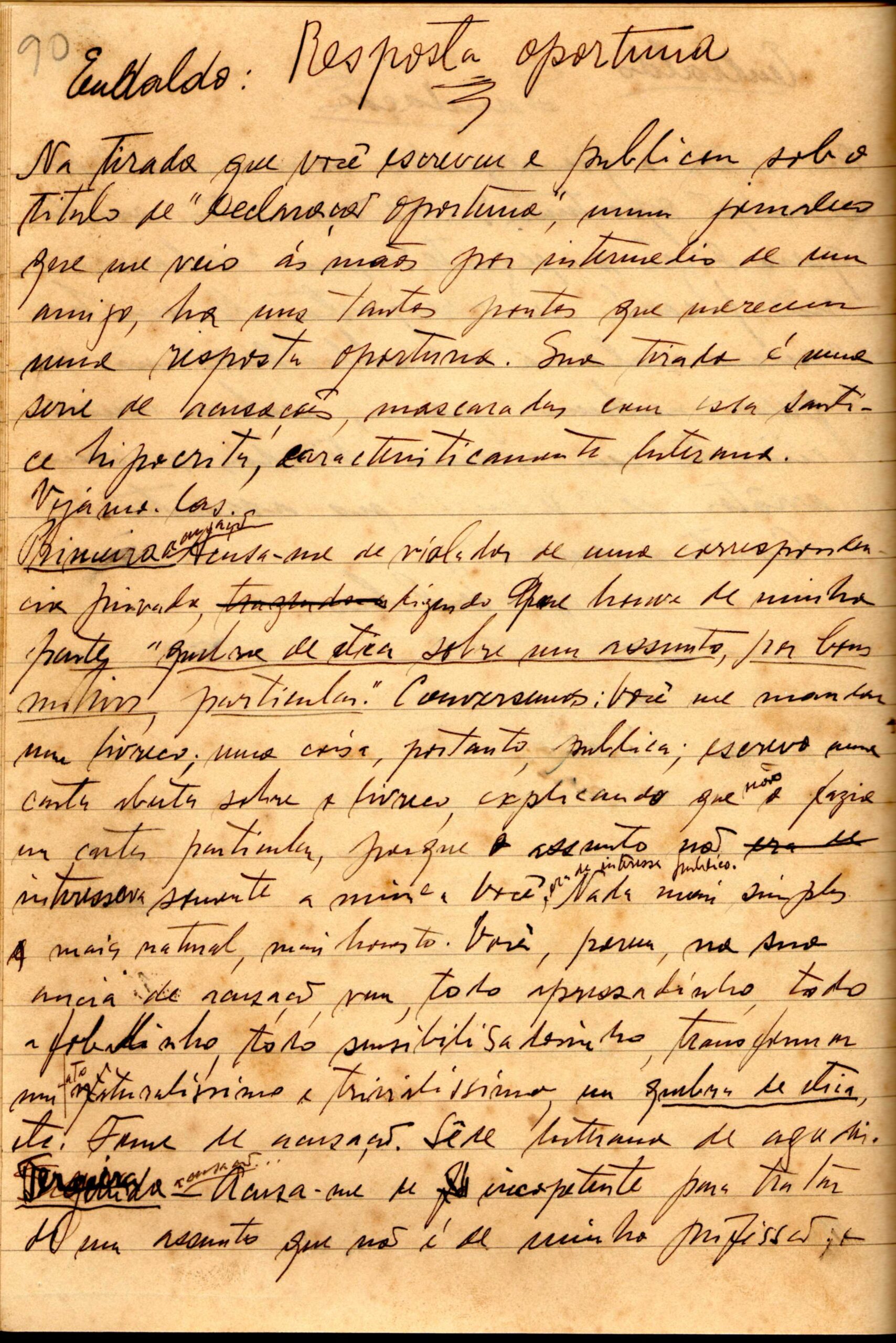 | 17 | ![]() | Eudaldo Saudações | Em mãos o jornalzinho com a sua “Declaração Oportuna” | [1942] | 89 | Religião. Literatura. Catolicismo. Protestantismo. Neste rascunho de carta, Motta afirma estar em posse do “jornalzinho” – O Lidador – que contém a carta aberta publicada por Eudaldo Lima, em 08/03/1942, por nome de Declaração Oportuna, que foi publicada em resposta a Carta Aberta a um amigo (Sobre um livro de polemica do Snr. Basílio Castro). Motta afirma que a “declaração” de Eudaldo não ficaria sem resposta e que sua “ancia caloura de publicidade” (citando trecho de carta de Eudaldo) não sofreria pausa nem esmorecimento em virtude das tiradas e dos arrotos de técnica no assunto por parte de Eudaldo. |